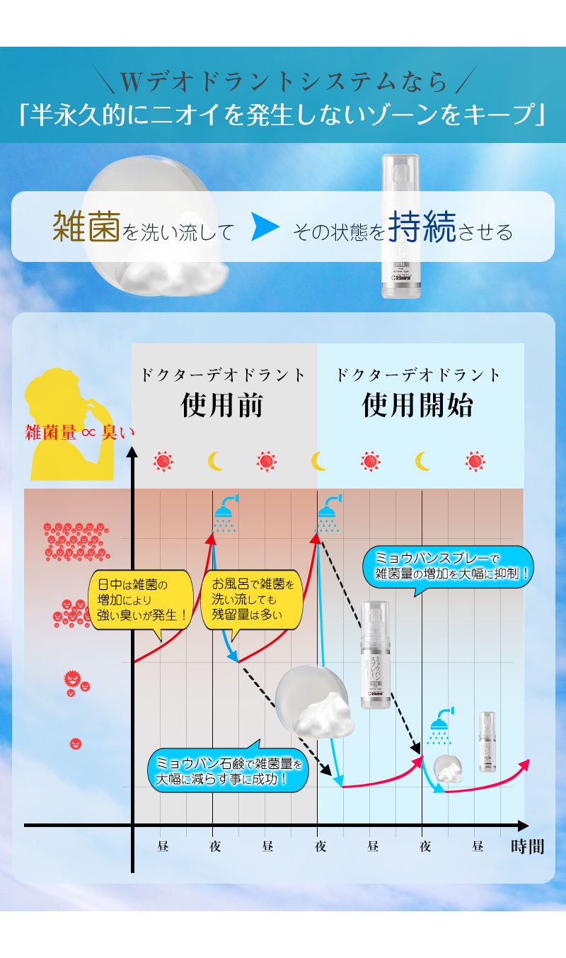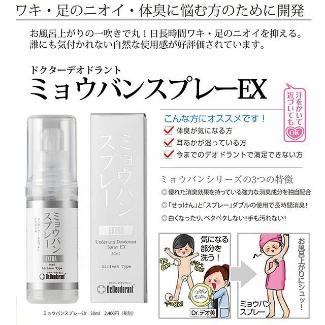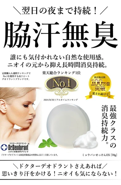 12年連續於日本樂天排行第一位,累計售出超過140萬件,為日本最受歡迎的身體止汗防臭系列。由醫生共同研發,採用獨特配方,研究達5年的臨床測試,長時間不讓產生氣味的雜菌繁殖,解決真正的氣味煩惱。重點針對因出汗或細菌引致的腋臭、腳臭、體臭、頭油味、私處異味等問題,讓臭味濃度減低或臭味消失。