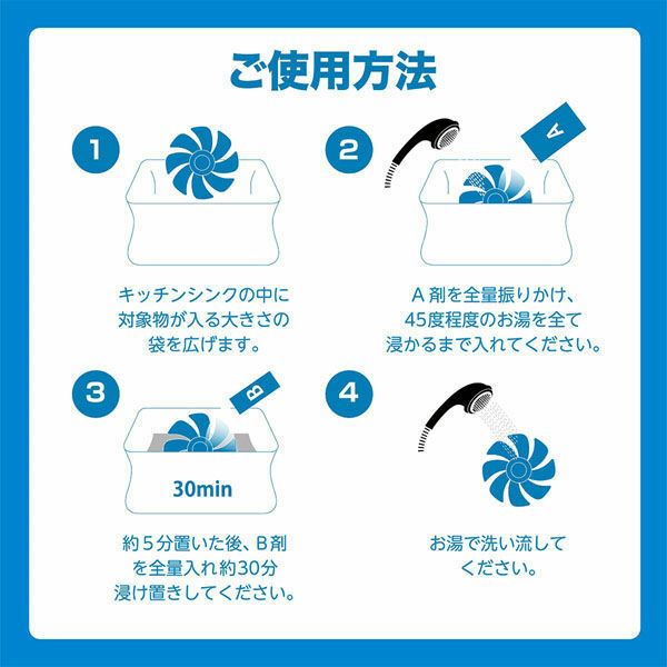 ❶ 倒入約約45度熱水,直到清潔物品完全被浸沒 ❷ 將A劑(粉劑)全部倒入水中 ❸ 約5分鐘後,將B劑(液劑)全部倒入水中,並浸泡約30分鐘(避免浸泡超過30分鐘,防止材質變色或塗層剝落) ❹ 用熱水沖洗物品。由於污垢已變得容易清除,可用海綿擦拭後沖洗效果更佳(油污冷卻後會凝固,因此請勿使用冷水)