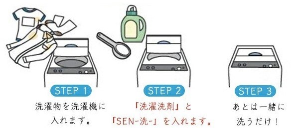 ❶ 將衣物放入洗衣機 ❷ 將SEN消毒洗衣粉加入衣物糟內(可與日常洗衣液同時使用) 使用份量請依樽背指示(樽內含專用量匙) ❸ 正常洗衣程序