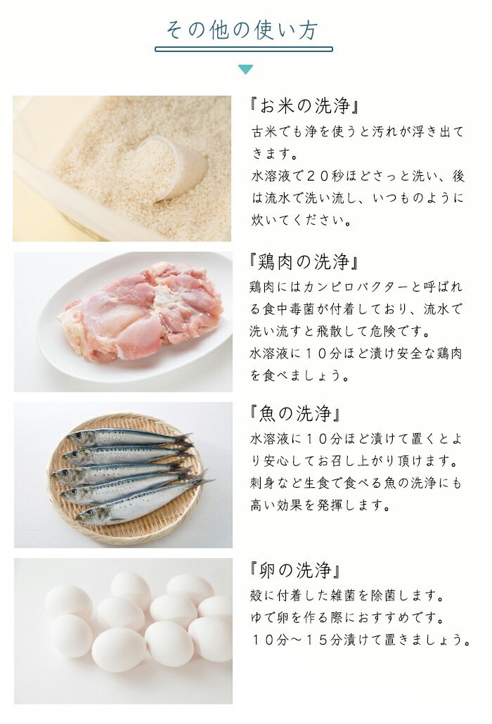 ● 去除食物中殘留農藥、病毒、大腸桿菌、金黃葡萄球菌等造成食物中毒的細菌 ● 防止食材發霉,延長保鮮期 ● 適用於蔬菜、水果、米、魚、肉、雞蛋等食材 ● 無色無味 ● 北海道全天然成份,不含防腐劑、滑石粉等有害化學成份 ● 日本食環境衛生研究所報告評定,有效殺滅冠狀病毒