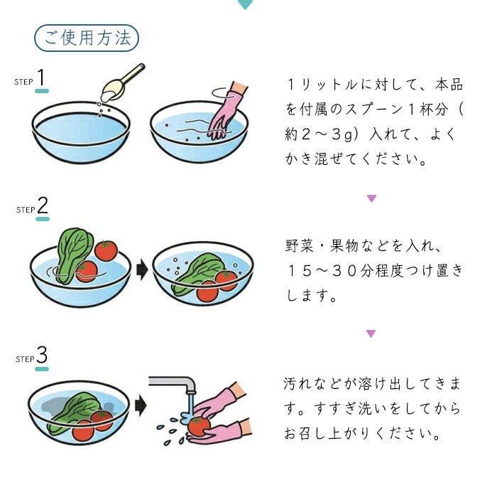 ❶ 將JYO蔬菜・水果洗淨劑加入水中使其溶解 ❷ 把食材浸泡在水中約15~20分鐘 ❸ 過水清洗