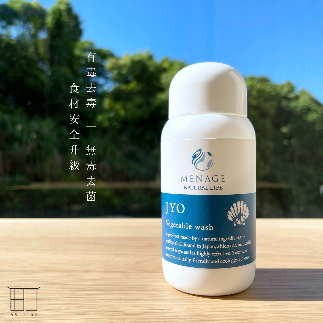 【MENAGE】JYO 蔬菜・水果洗淨劑,去除食物中殘留農藥、病毒、大腸桿菌、金黃葡萄球菌等造成食物中毒的細菌。防止食材發霉,延長保鮮期。適用於蔬菜、水果、米、魚、肉、雞蛋等食材。無色無味。日本食環境衛生研究所報告評定,有效殺滅冠狀病毒。