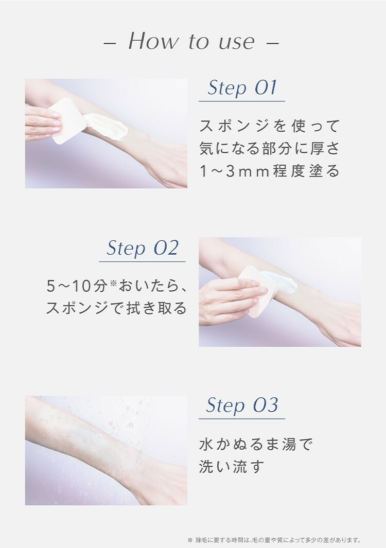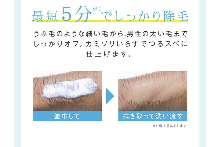 即使肉眼看不到的小毛髮,養成身體除毛的習慣,皮膚不但更幼滑,塗抹的護膚品亦更吸收,護膚事半功倍。美膚與除毛的雙重效果,只需5分鐘即可將老角質和毛髮去除,用後皮膚非常細緻柔滑。塗抹5分鐘後一抹過水即可,十分方便易用。87%由天然成分構成,對肌膚溫和。專利成份「EpiControl EX」,特殊的保濕成分配方,亦含有胎盤精華、透明質酸、膠原蛋白等18種保濕成分。可用於:腋下、胸部、手部、肚、VIO私處、手指、腳部、腳趾。淡柑橘香味。