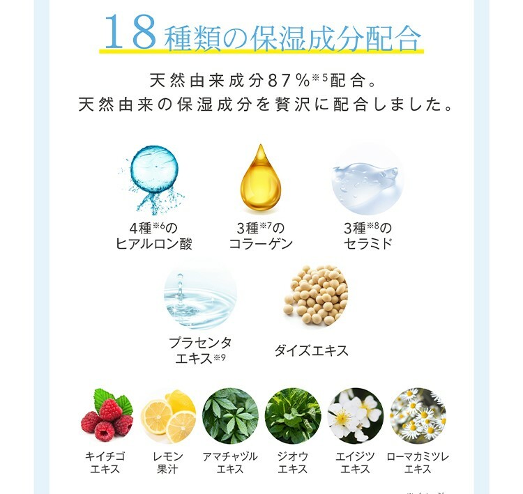 | 主成份 | 硫酸鈣、精製水、鯨蠟醇、丙二醇、液態石蠟、聚氧乙烯硬脂醇醚、石蠟、1,3-丁二醇、水解黑豆提取物、萱草花發酵液、大馬士革玫瑰花提取物、親水性乳酸菌發酵米、胎盤提取物、水解透明質酸、透明質酸羥丙基三甲基氯化銨、乙酰化透明質酸鈉、透明質酸鈉、膠原蛋白三肽、水解異硬脂酸膠原、膠原蛋白液、柚子磁酮、菠蘿磁酮、米糠鞘磁酮脂質、大豆提取物、甜茶提取物、羅馬洋甘菊提取物、地膽草提取物、艾草提取物、野草莓提取物、檸檬果汁、植物性角鯊烷、水解絲蛋白液、氫化雞蛋黃磷脂、雞蛋黃磷脂酪蛋白、硬脂醇、葡萄糖酸鈉、1,2-戊二醇、羧烷基聚合物、氫氧化鉀、氫氧化鈉、苯氧乙醇、天然香料 |