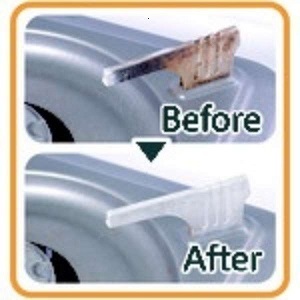 不需加入任何化學液體,簡單於明火爐頭燒焦的部份上擦拭,即可輕鬆去除焦黑。研磨膠材質以其彈性和磨蝕力吸油除污,去除沉積難洗的焦黑。天然研磨橡膠,不傷物件表面。