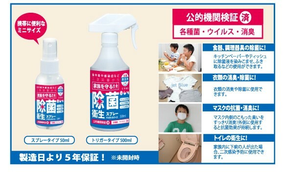 ● 日本食環境衛生研究所測試,有效對抗冠狀病毒 ● 日本防災安全協會承認為指定災難後採用產品 ● 日本總合健康開發研究所評定為對皮膚沒有刺激性,安全接觸度如碰到水一樣安全 ● 大阪府立產業技術總合研究所測試報告,有效去除布料纖維細菌、臭味 ● 日本食物分析中心、法人KIKEN 試驗認證中心及京都產業大學,殺菌消臭功效認證