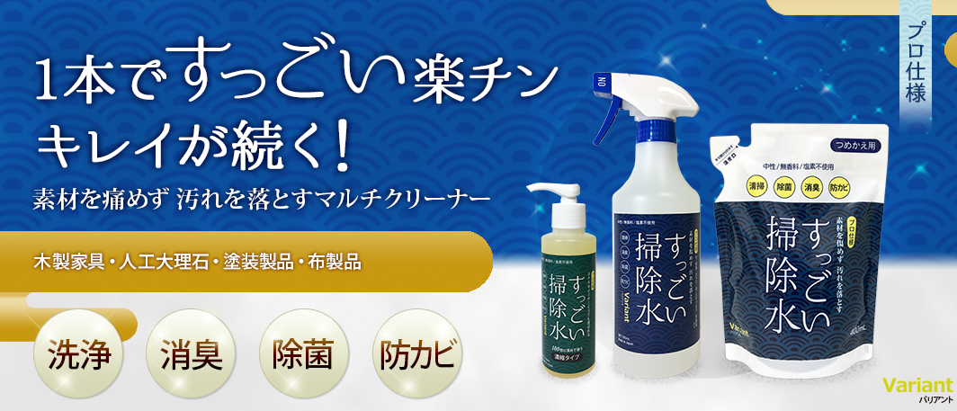 掃除水(濃縮裝)適合處理較強油漬污漬。含負離子成份,不使用化學刺激物,亦能輕易去除家居日常污垢。可以在廣泛的範圍內,殺滅同抑制真菌和細菌。即使在潮濕的地方,殺菌力也不會下降。殺菌率:99.999%。