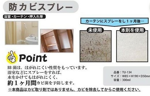 日本專業家居塗層公司出品。成份含納豆桿菌會依附於物件表面,對抗霉菌形成和滋生,防止家居霉菌出現。可使用於浴室、浴簾、牆壁等容易發霉的地方。噴灑一次防霉長達1周~1個月,期間霉菌難以形成,長遠使用防止家居出現霉菌黑點。100%天然成份,不含刺激化學物,有嬰兒或寵物家居均安心使用。