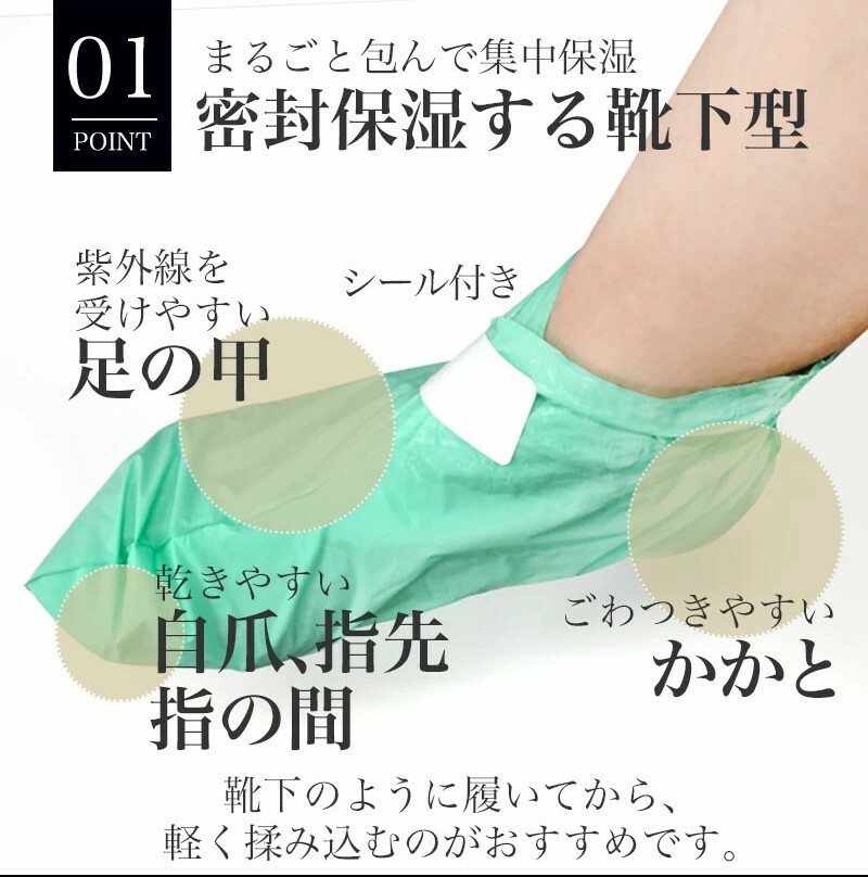 | ❶ 使用前請先清洗雙腳,確保腳部為無水分的乾淨狀態 ❷ 從包裝中取出腳套,從腳踝部分的兩側拉開以開封 ❸ 套入腳部後,輕輕揉捏以讓美容液均勻覆蓋指間等部位,敷15~30分鐘 ❹ 如需固定,可使用附帶的貼紙環繞腳踝粘貼 ❺ 取下腳套後,將殘留的美容液輕拍至完全吸收 |