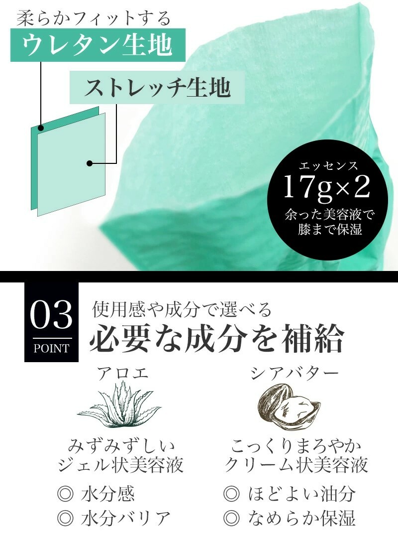 市場上少有的設計~腳套內多了一層不織布,尤如紙面膜般,貼緊雙腳讓精華完全吸收。兩種配方不同功能:【蘆薈】:內含啫喱狀美容液,大大提供水分補給,減少死皮,適合乾燥痕癢的雙腳;【乳木果油】:內含乳霜狀美容液,提供油分補給,減少腳跟龜裂可能。用後即時效果,無黏膩感。