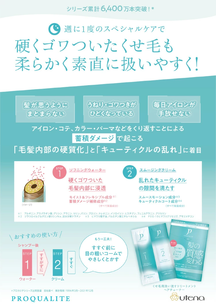 針對因熱力吹髮、漂染髮、電髮等化學物或熱力引致頭髮內部硬化、角質層紊亂問題。簡單的2部護理,先軟化後修復,柔滑效果即時明顯。持績每星期使用,抵抗每天外來的損耗,讓僵硬和糾結的頭髮變得柔軟、易於打理。直髮捲髮均適用。無色弱酸性。