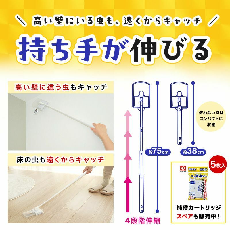 與昆蟲保持距離,遠距離捕捉+停止其活動及逃脫。捕捉後可直接丟棄,不用透過紙巾感受到昆蟲。伸縮柄最長可延伸至75厘米,可捕捉牆壁或天花板上的蟲子。平日收起方便存放。捕蟲盒黏力大,適用於捕捉蟑螂、蜈蚣、臭蟲、蜘蛛等各種害蟲,以及檐蛇(四腳蛇)。