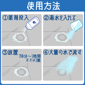 ❶ 在渠口外周及渠口撒上消毒粉 ❷ 倒入約300~400ml暖水(約40°C~50°C) ❸ 放置1小時後,大量沖水即可