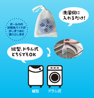 將淨化波波放入洗衣機洗桶內,如往常放入衣物洗衣即可。 洗衣程序完成後,淨化波波留在洗桶內不用取出。一個可放4個月。